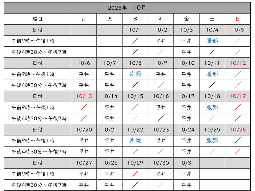 10月の担当医スケジュールを掲示しておりますので、ご確認ください。