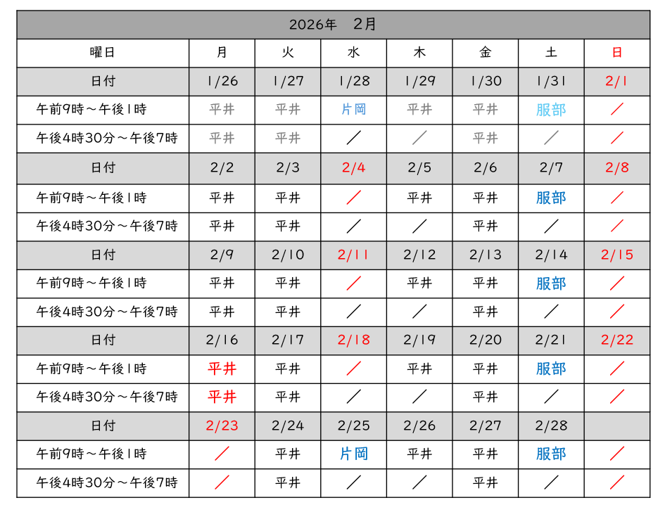 2月の担当医スケジュールを掲示しておりますので、ご確認ください。